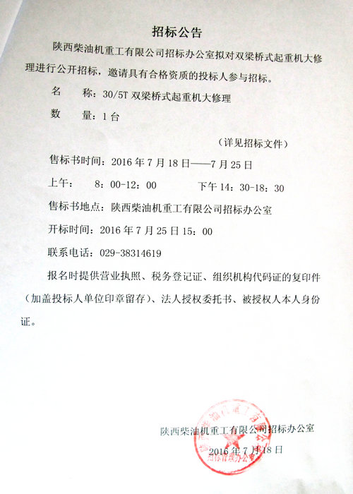 雙梁橋式起重機(jī)大修招標(biāo)公告