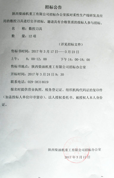 柔性生產(chǎn)線研發(fā)及應(yīng)用的數(shù)控刀具招標(biāo)公告