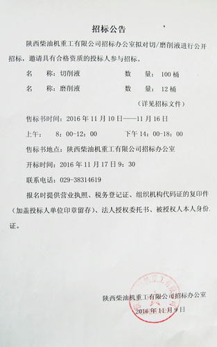 切/磨削液招標公告