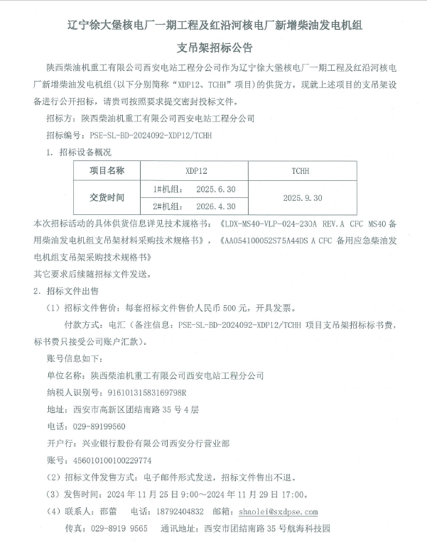 遼寧徐大堡核電廠一期工程及紅沿河核電廠新增柴油發(fā)電機(jī)組支吊架招標(biāo)公告