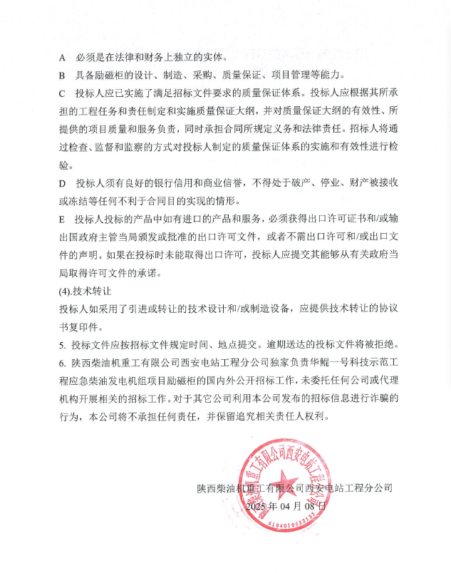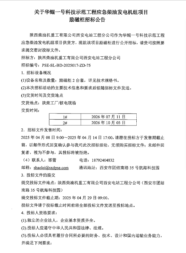 華鯤一號科技示范工程應(yīng)急柴油發(fā)電機(jī)組項目勵磁柜招標(biāo)公告